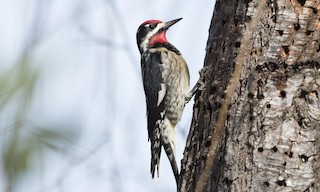 What kind of bird is a red naped sapsucker? Beautiful plumage with mostly red head and breast and bold white slash on the shoulder. When do red naped sapsuckers come to my yard? What does a yellow bellied sapsucker look like? Their upperparts are black barred with white, and they have a bold white stripe across each wing. Hybrids typically have black feathers on the breast, more black on the face and black feathers in the nape. Breeds in montane forest, often with aspens or willows. Note the black band below the red on the breast, and the black extending up the nape of the neck to behind the eye. Also note limited white mottling on back, and no black on the breast. Their heads are bright red with black stripes through and above the eyes. They drill neat little rows of holes in aspen, birch, and willow to lap up the sugary sap that flows out. The presence of sap wells is a good indication that they are around, but so are their harsh wailing cries and stuttered drumming. What makes a sapsucker different from other woodpeckers?