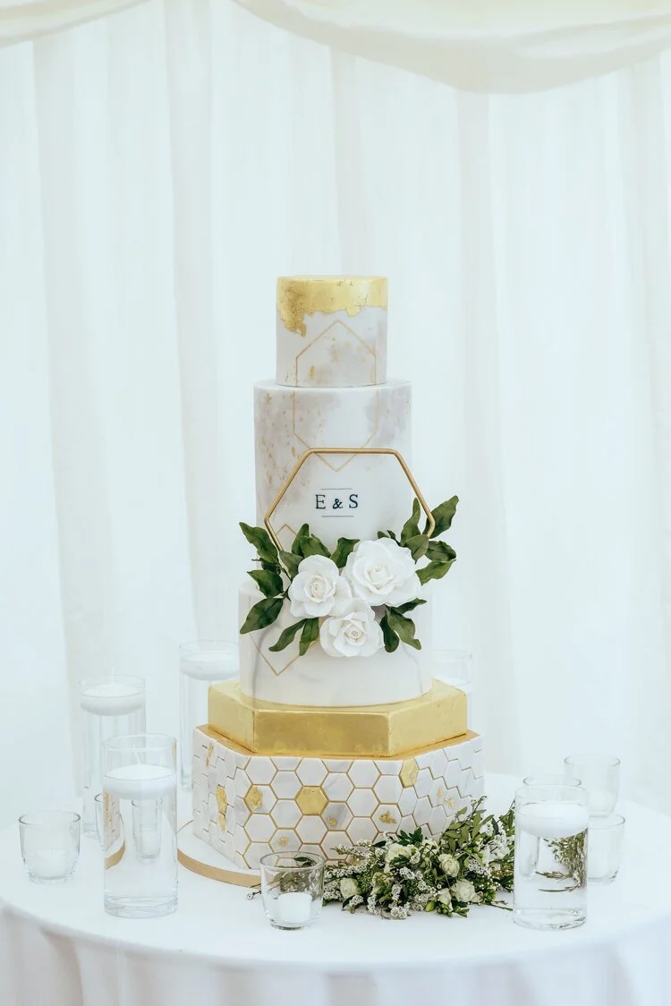 A grey marble wedding cake decorated with gold leaf and a large sugar geode in purple for an elegant wedding modern wedding cakes. Cake design meets graphic design in this stunning hey there, cupcake design.